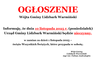 OGŁOSZENIE Wójta Gminy Lidzbark Warmiński Informuję, że dnia 10 listopada 2025 r. (poniedziałek) Urząd Gminy Lidzbark Warmiński będzie nieczynny. w zamian za dzień 1 listopada 2025 – święto Wszystkich Świętych, które przypada [...]
