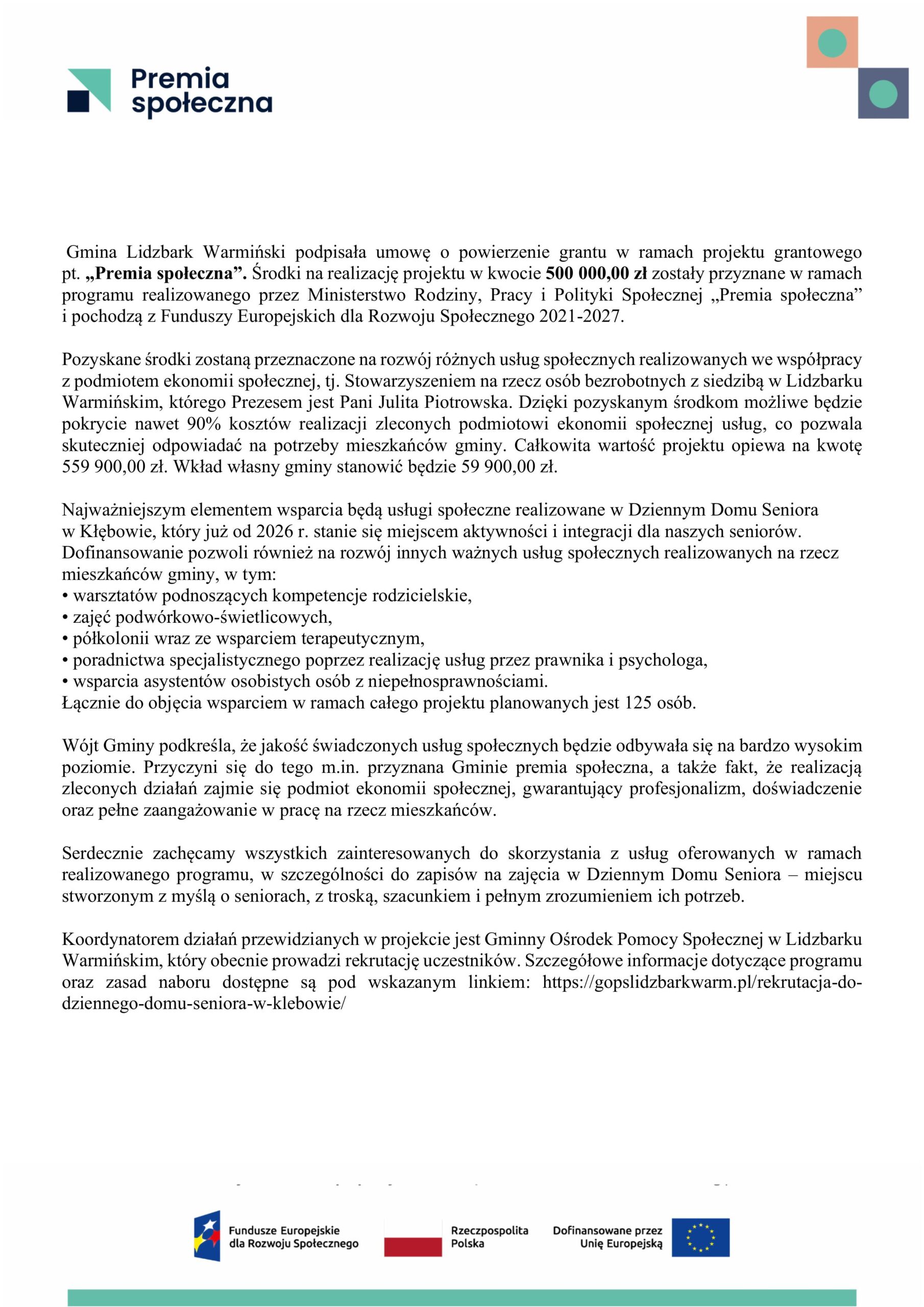 Gmina Lidzbark Warmiński podpisała umowę o powierzenie grantu w ramach projektu grantowego pt. „Premia społeczna”. By Robert Gobis|2025-12-17T09:42:13+01:0016 grudnia, 2025|Aktualności| Premia społeczna po podpisaniu umowy