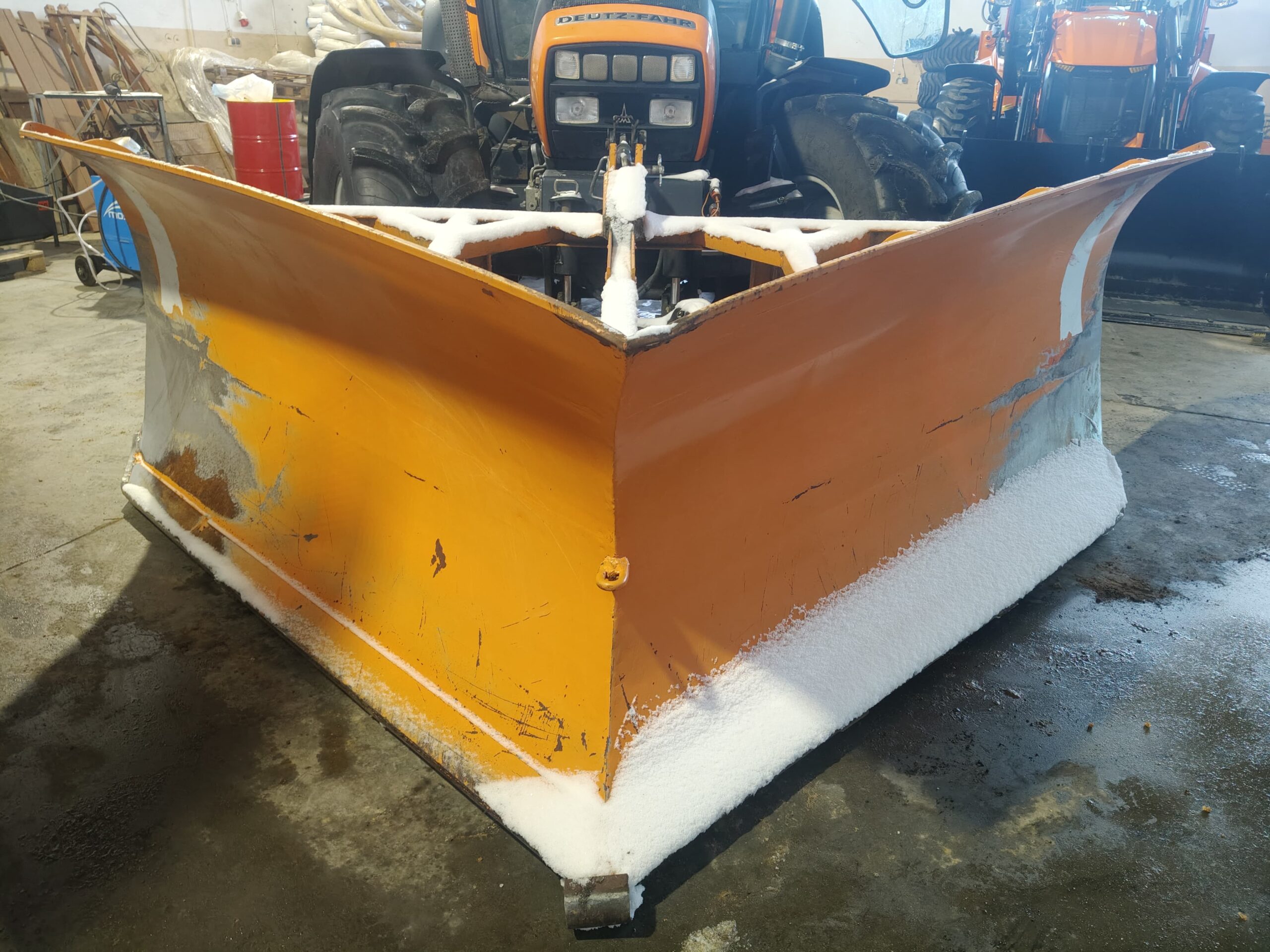 - pług odśnieżny ciężki, typu strzała, montowany na przedni TUZ ciągnika;