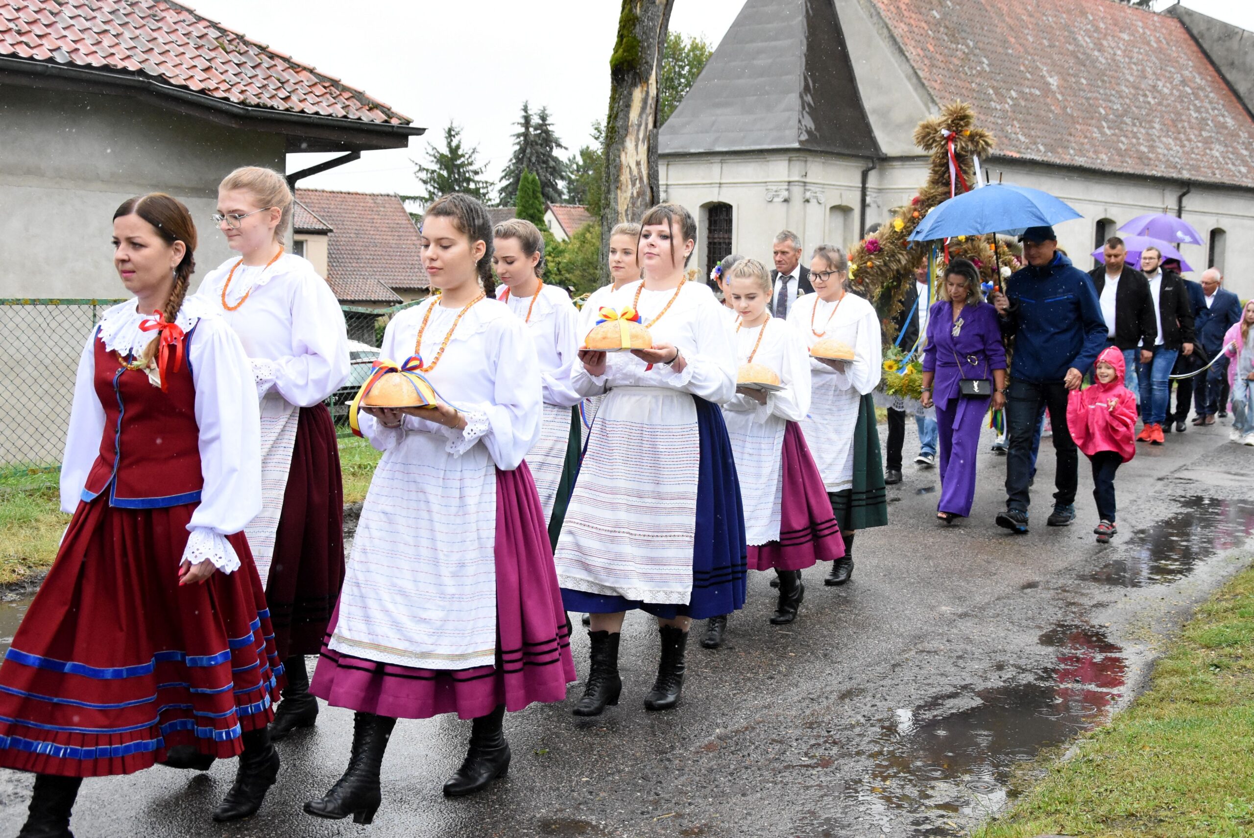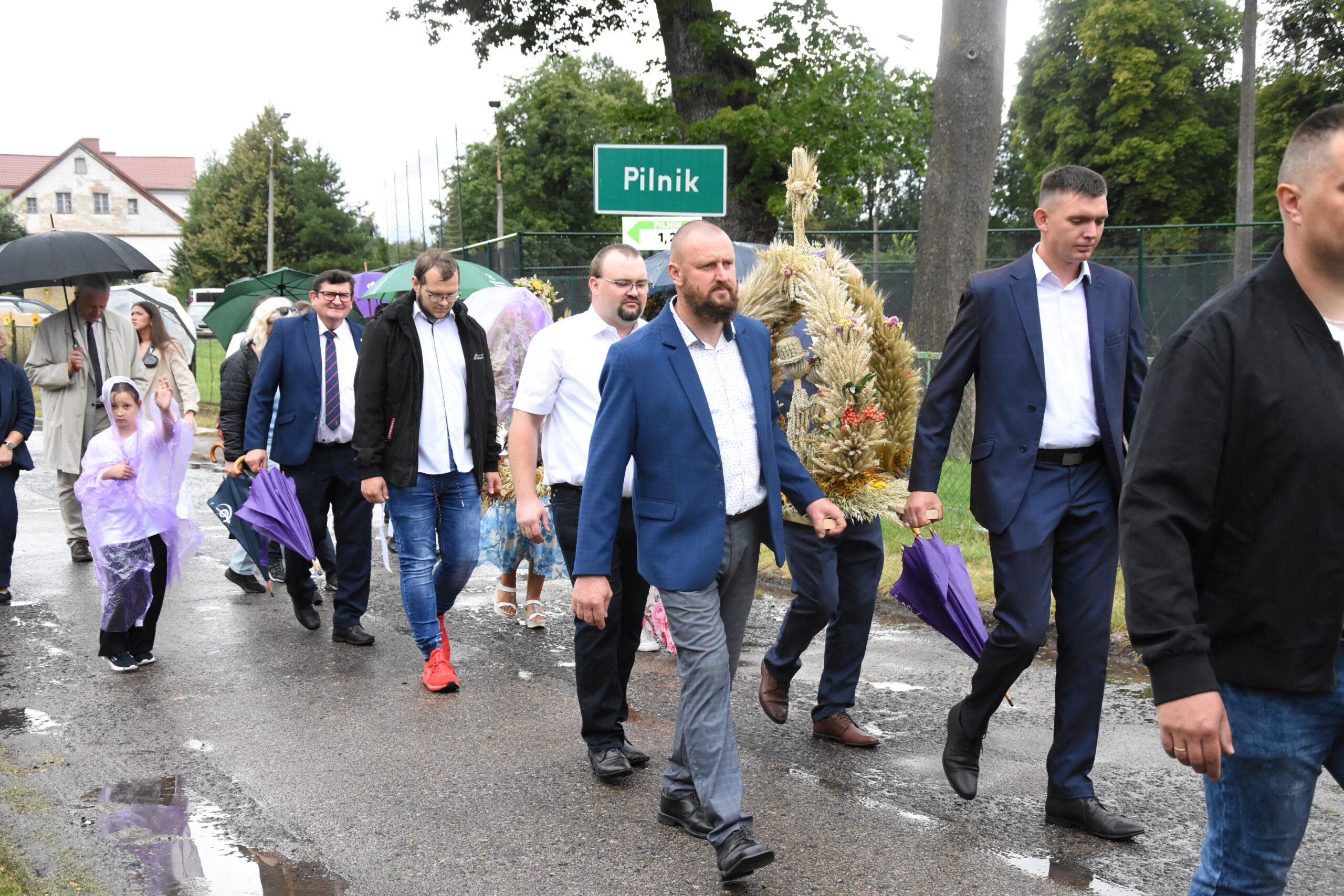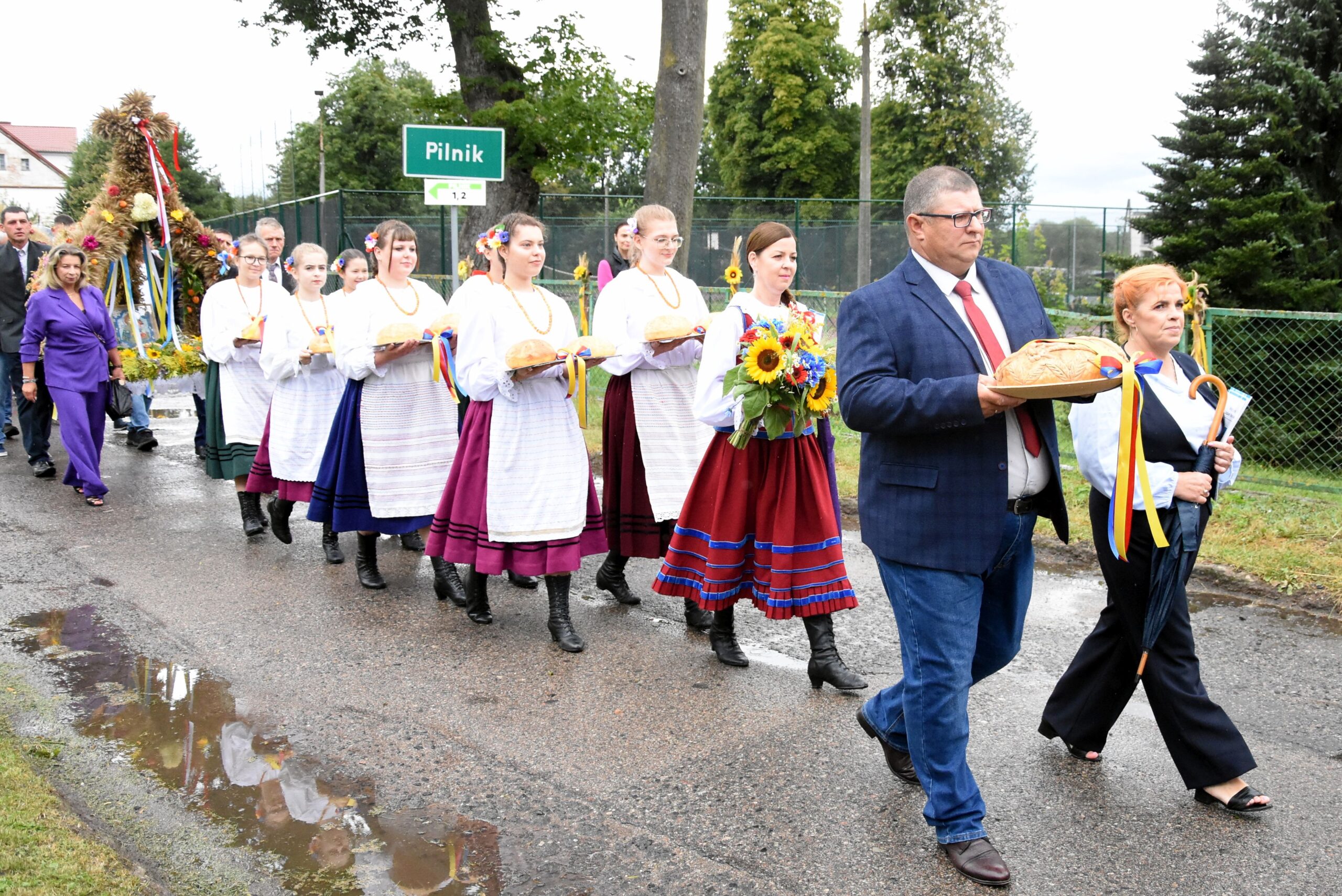 Po zakończeniu eucharystii barwny korowód dożynkowy, prowadzony przez Reprezentacyjną Orkiestrę Dętą Gminy Lidzbark Warmiński w towarzystwie Mażoretek, przeprowadził wszystkich zebranych gości na plac przy Gminnym Centrum Kultury w Pilniku. Tam nastąpił kulminacyjny moment obrzędu dożynkowego – Starostowie Dożynek Państwo Joanna i Leszek Kozłowscy z Knip, przekazali na ręce gospodarza uroczystości, Wójta Gminy Fabiana Andrukajtis, symboliczny bochen chleba wypieczony z tegorocznych zbóż. Chlebem tym, zgodnie z tradycją, podzielono się z wszystkimi uczestnikami wydarzenia, co stało się pięknym gestem jedności i wspólnoty.