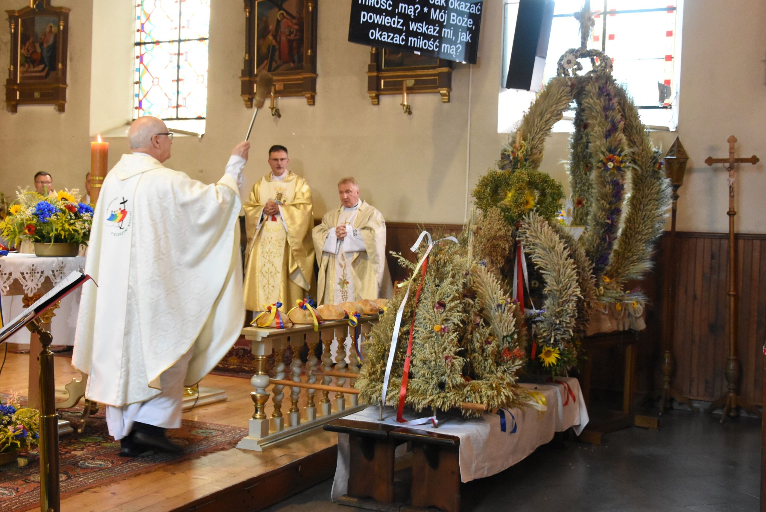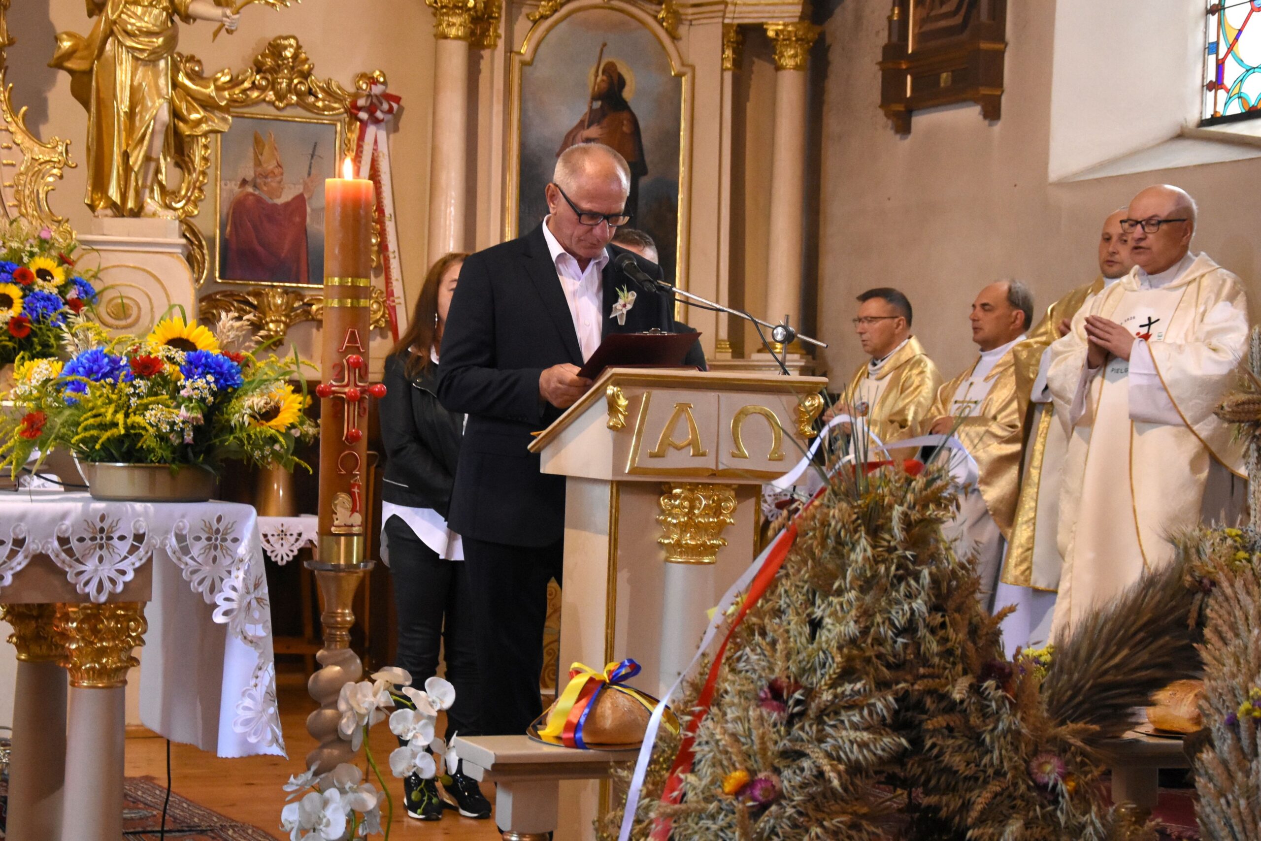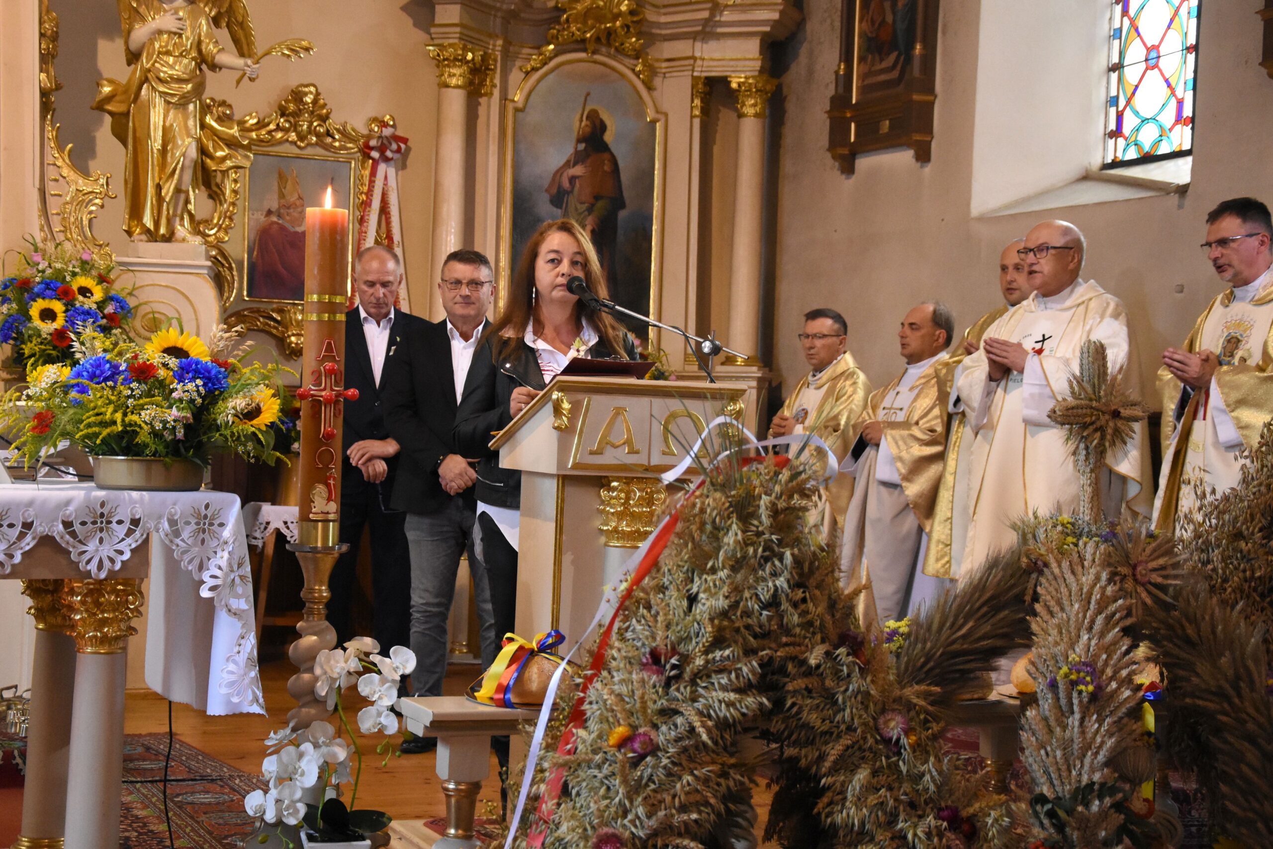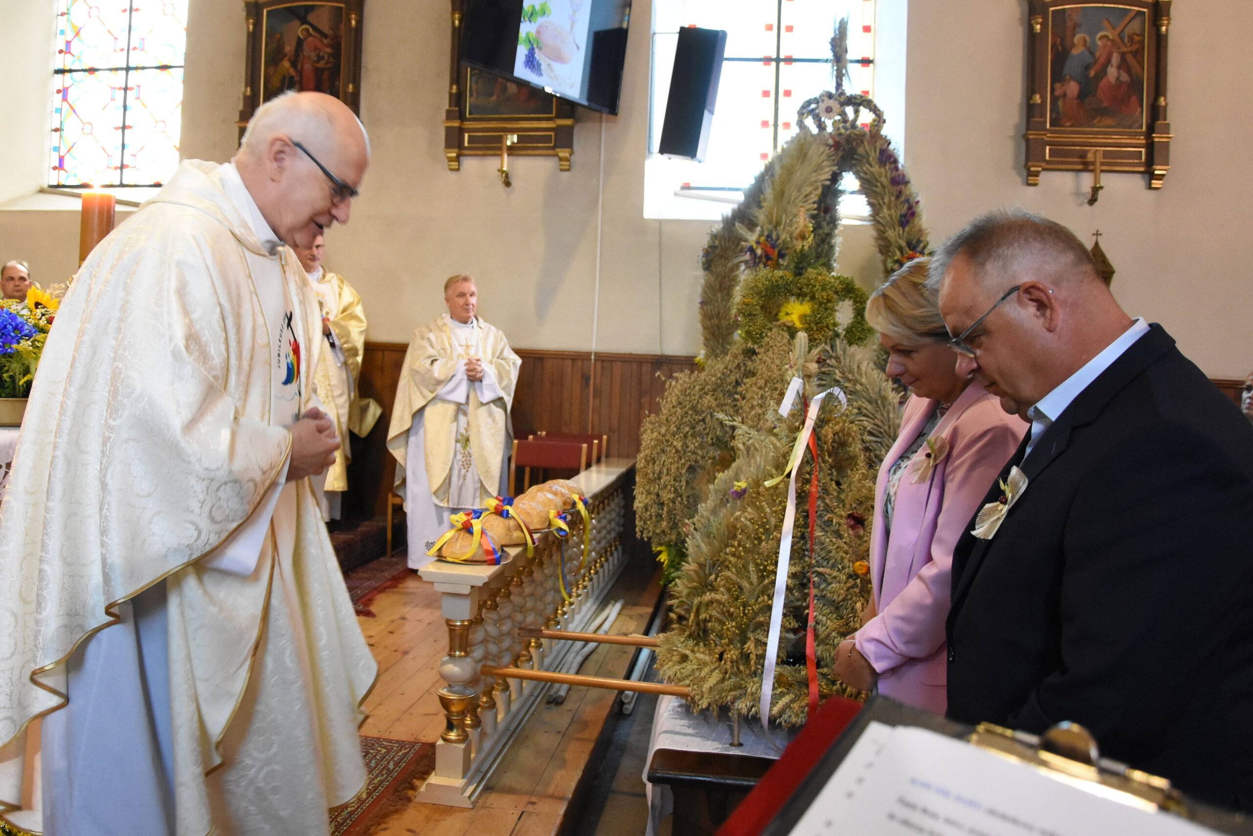 Wyrażamy wdzięczność za możliwość duchowego rozpoczęcia świętowania Dożynek Gminnych w progach kościoła parafialnego p.w. Podwyższenia Krzyża Świętego oraz obecność podczas dzisiejszego wydarzenia wszystkim Księżom, a nade wszystko, Proboszczowi Księdzu Prałatowi, Dziekanowi dekanatu lidzbarskiego Jerzemu Rożentalskiemu.